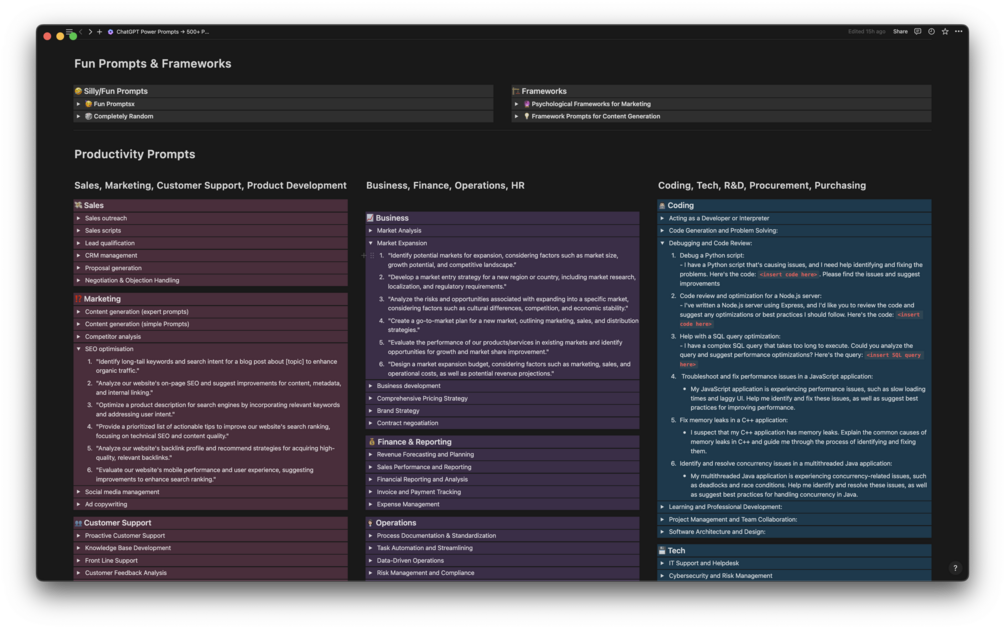 - Specialized productivity prompts for a plethora of domains: sales, marketing, customer support, product development, business, finance, operations, HR, coding, tech, R&D, procurement, purchasing, and more.