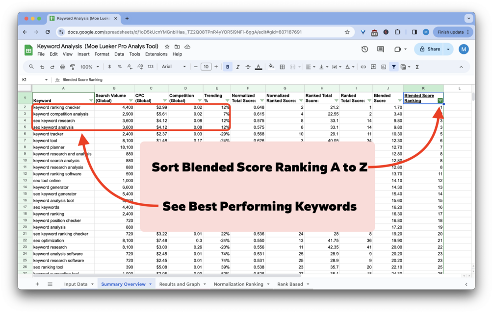 - Blended Ranking Score: A unique formula that combines normalized and rank-based comparisons to highlight the most potent keywords.